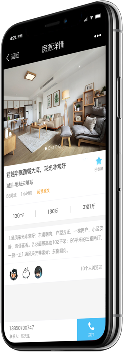房蟻能給你低成本的使用體驗,只需3秒就能讓它開始為你服務。你無須下載APP,關注房蟻微信公眾號即可。房蟻的每一次房源推送都是一條微信信息,點開即可看到房源詳情并撥打業主電話,每個人都能輕松自如的使用它。